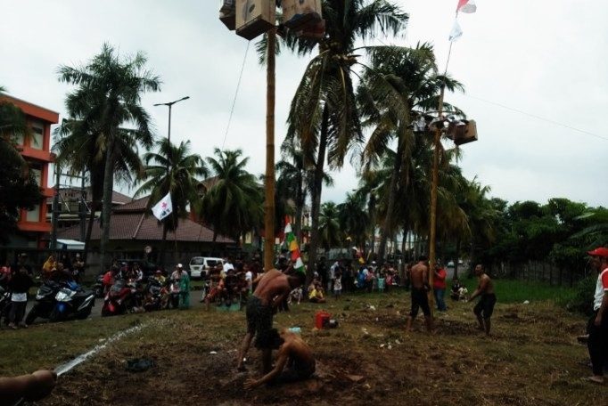 KOTA TANGERANG,PenaMerdeka – Meriahkan HUT Kota Tangerang yang ke-26, warga di Kecamatan Pinang menggelar lomba panjat pinang di perumahan Buana Gardenia, Pinang, Kota Tangerang.