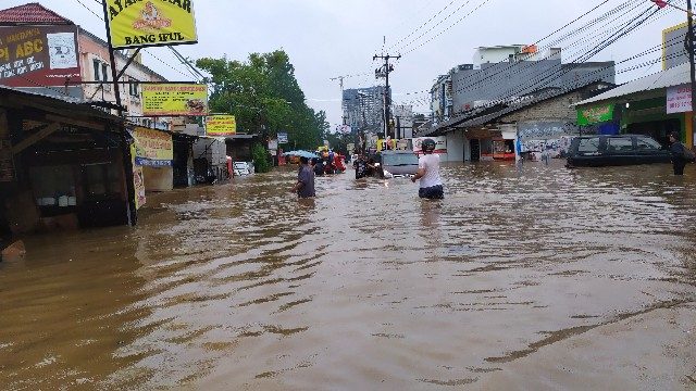 Pantauan di lokasi, tepatnya di depan Perumahan Ciledug Indah, Kelurahan Pedurenan, Kecamatan Karang Tengah, Kota Tangerang, ketinggian air di jalan raya mencapai ketinggian 80 cm.
